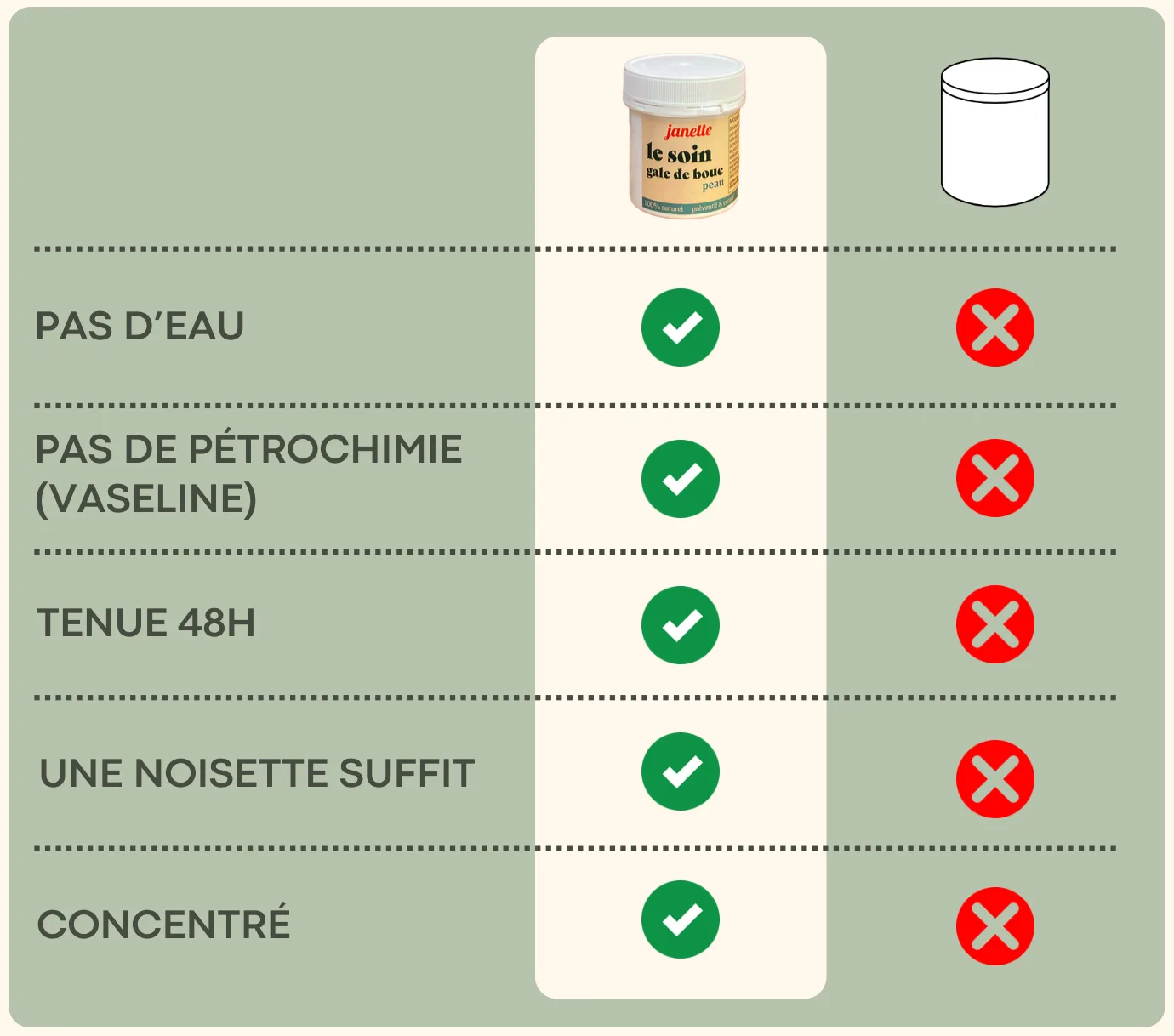 La texture est vraiment parfaite : épaisse mais pas trop, idéal pour une application qui dure longtemps sur la peau (même avec un cheval au pré h24) et le savon pas encore utilisé mais j’aime l’idée du savon « solide »